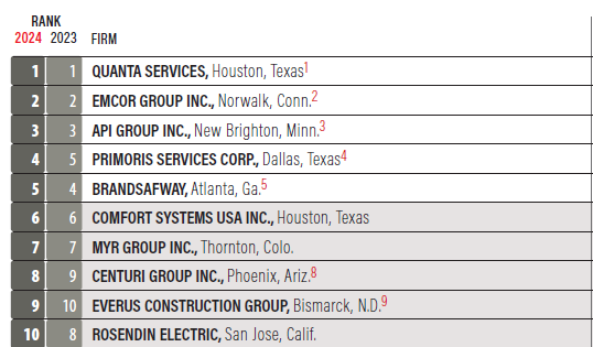 This marks MYR Group’s 28th consecutive year ranking in the top five electrical contractors – a testament to our team’s dedication to excellence. This outstanding achievement highlights our leadership in the industry and reinforces our reputation for quality and innovation.