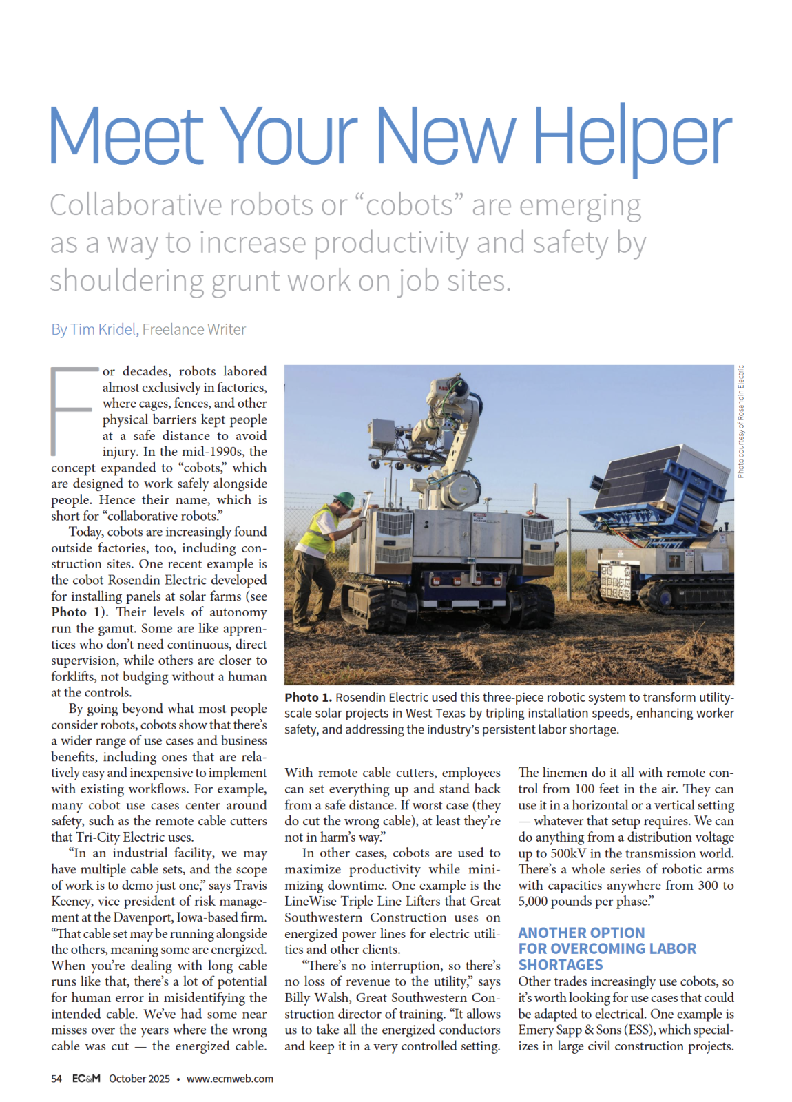 The use of collaborative robots or “cobots” in construction is on the rise according to EC&M magazine. In their October 2025 edition, they shared a number of ways cobots are helping increase productivity and safety on job sites and cited several companies including MYR Group subsidiary Great Southwestern Construction.